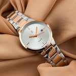 A men's watch with a quartz movement typically features a precise and reliable mechanism. The golden case paired with a white dial offers a classic and elegant aesthetic, suitable for various occasions.