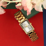 A men's watch with a quartz movement typically features a precise and reliable mechanism. The golden case paired with a white dial offers a classic and elegant aesthetic, suitable for various occasions.