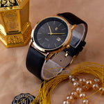 A men's watch with a quartz movement typically features a precise and reliable mechanism. The golden case paired with a white dial offers a classic and elegant aesthetic, suitable for various occasions.