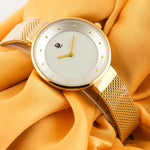 A men's watch with a quartz movement typically features a precise and reliable mechanism. The golden case paired with a white dial offers a classic and elegant aesthetic, suitable for various occasions.