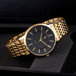 A men's watch with a quartz movement typically features a precise and reliable mechanism. The golden case paired with a white dial offers a classic and elegant aesthetic, suitable for various occasions.