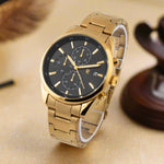 A men's watch with a quartz movement typically features a precise and reliable mechanism. The golden case paired with a white dial offers a classic and elegant aesthetic, suitable for various occasions.