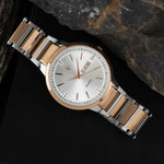 A men's watch with a quartz movement typically features a precise and reliable mechanism. The golden case paired with a white dial offers a classic and elegant aesthetic, suitable for various occasions.
