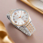 A men's watch with a quartz movement typically features a precise and reliable mechanism. The golden case paired with a white dial offers a classic and elegant aesthetic, suitable for various occasions.