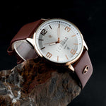 A men's watch with a quartz movement typically features a precise and reliable mechanism. The golden case paired with a white dial offers a classic and elegant aesthetic, suitable for various occasions.