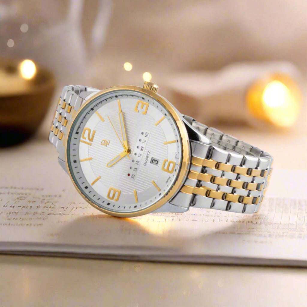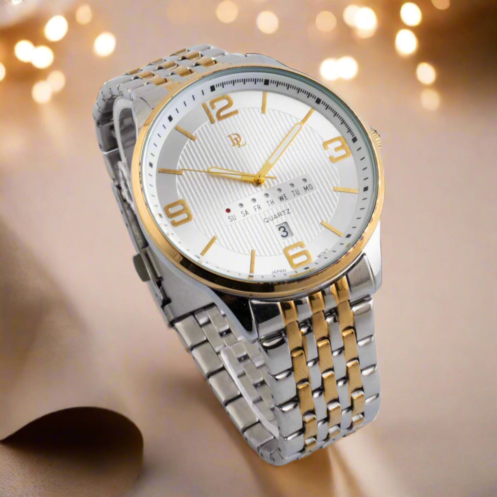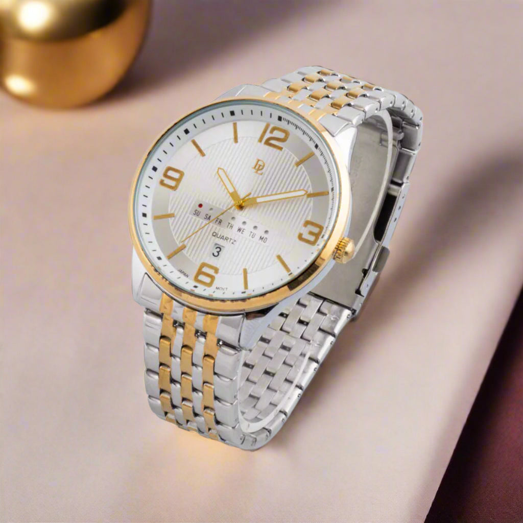 A men's watch with a quartz movement typically features a precise and reliable mechanism. The golden case paired with a white dial offers a classic and elegant aesthetic, suitable for various occasions.