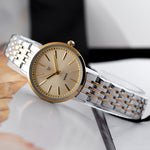 A men's watch with a quartz movement typically features a precise and reliable mechanism. The golden case paired with a white dial offers a classic and elegant aesthetic, suitable for various occasions.