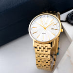 A men's watch with a quartz movement typically features a precise and reliable mechanism. The golden case paired with a white dial offers a classic and elegant aesthetic, suitable for various occasions.