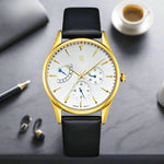 A men's watch with a quartz movement typically features a precise and reliable mechanism. The golden case paired with a white dial offers a classic and elegant aesthetic, suitable for various occasions.