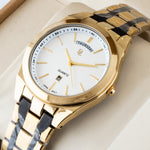 A men's watch with a quartz movement typically features a precise and reliable mechanism. The golden case paired with a white dial offers a classic and elegant aesthetic, suitable for various occasions.
