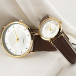 A men's watch with a quartz movement typically features a precise and reliable mechanism. The golden case paired with a white dial offers a classic and elegant aesthetic, suitable for various occasions.