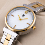 A men's watch with a quartz movement typically features a precise and reliable mechanism. The golden case paired with a white dial offers a classic and elegant aesthetic, suitable for various occasions.