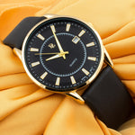 A men's watch with a quartz movement typically features a precise and reliable mechanism. The golden case paired with a white dial offers a classic and elegant aesthetic, suitable for various occasions.
